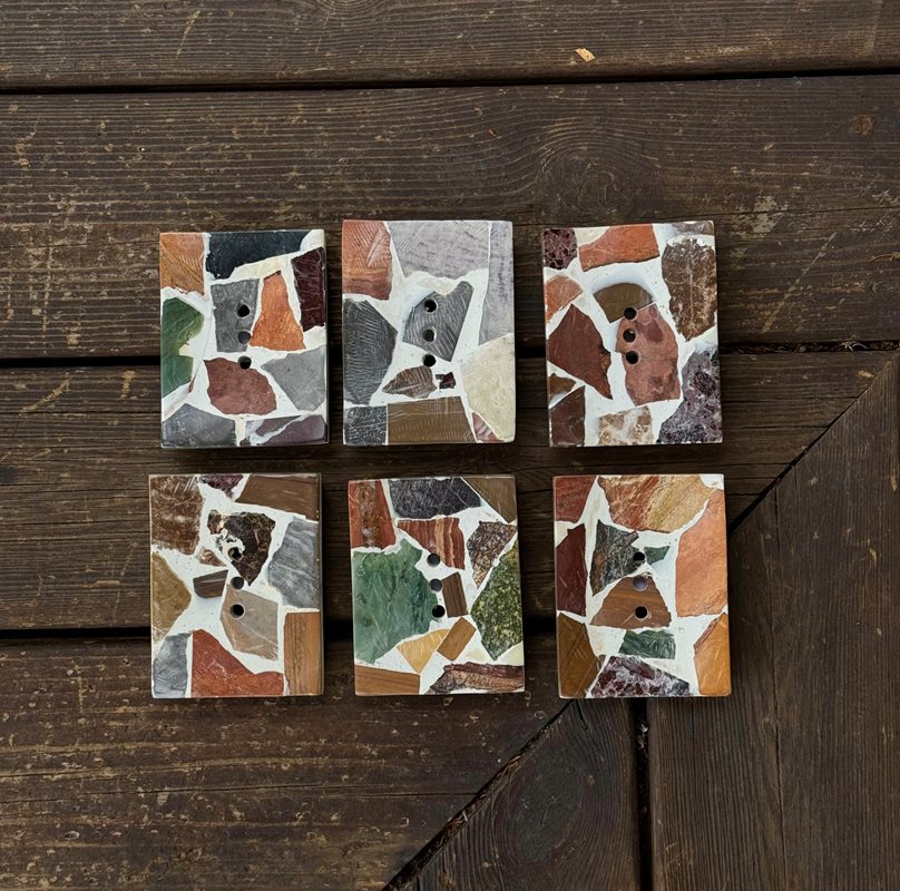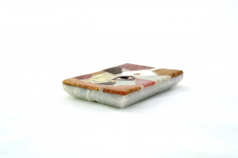 Rejält tvålfat med botten av marmor och toppen är i mosaik av olika stenar.